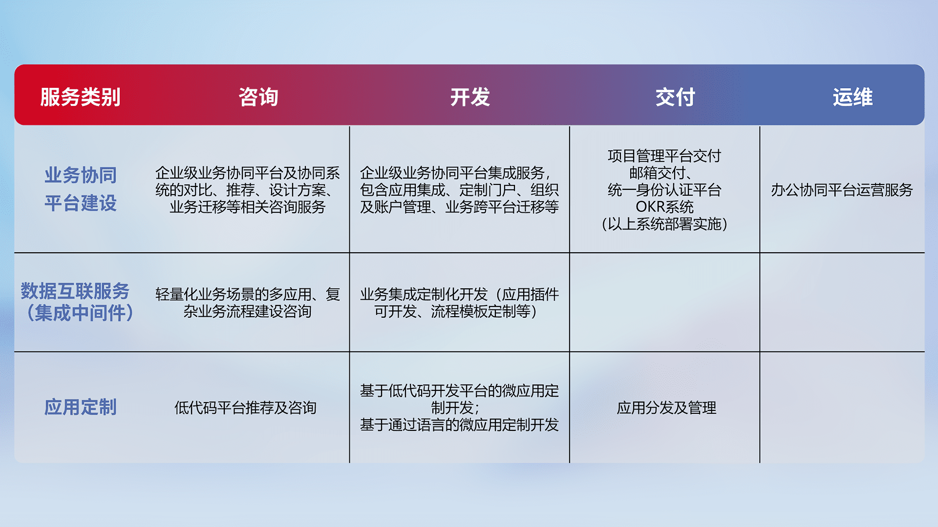针对钉钉、、、、企微、、、、IDaas等平台级产品提供产品的规划、、、方案、、、、交付、、、定制化开发等服务,,,,实现如统一协同办公、、智能客户服务、、混合会议管理、、智能数据查询、、、等业务场景,,实现数字化转型。。