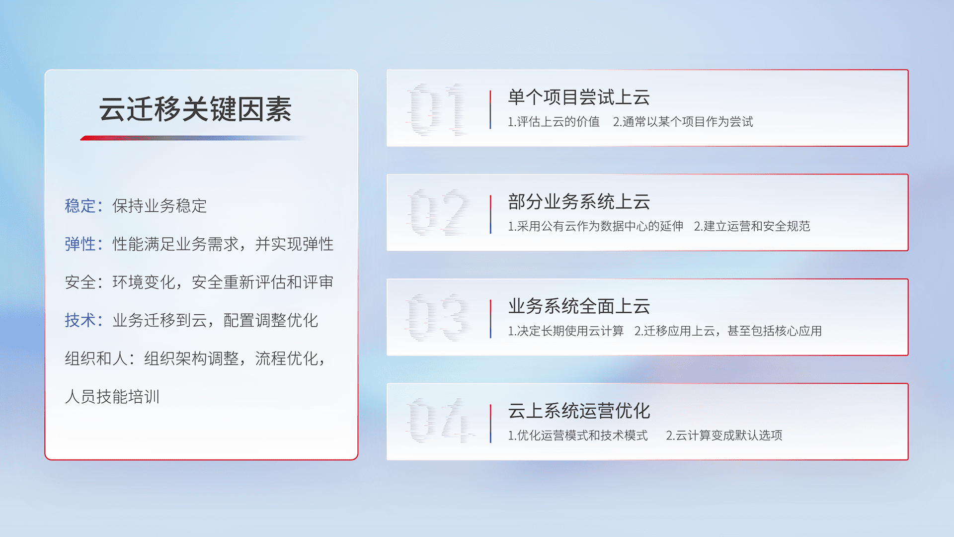 结合实际业务,,,,从规划设计、、云平台选型、、、云原生改造、、、、数据迁移、、、集成交付,,迁移全过程为客户识别最佳上云路径,,,,做好风险识别管理,,,设计网络架构、、身份权限、、安全审计合规、、、、操作审计、、、、日志审计、、、监控告警策略、、多站点容灾设计等,,,,对云上基础设施进行整体规划,,,,提升IT治理水平,,,,以满足弹性、、、、高可用、、、、高性能的需求。。