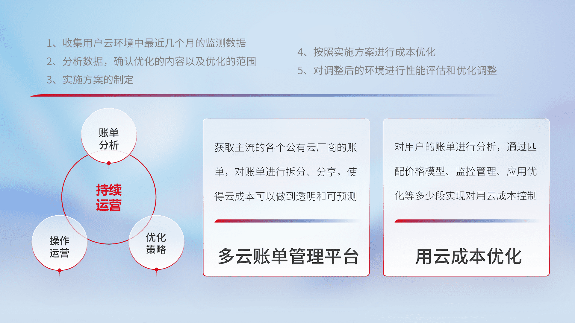 通过多云纳管,,,以统一的资源数据模型把客户的云资源进行抽象和封装,,进而实现对多云资源的统一操作,,,,保障云资源管理的可靠性、、、稳定性与可用性。。。。量身定制化运维内容,,,,配置、、、、开发运维、、、、补丁管理、、、、备份、、、、监控、、、、认证和访问管理、、、、审计和日常巡检等,,,保障在用云过程中的可靠度,,,稳定度以及高可用率。。。